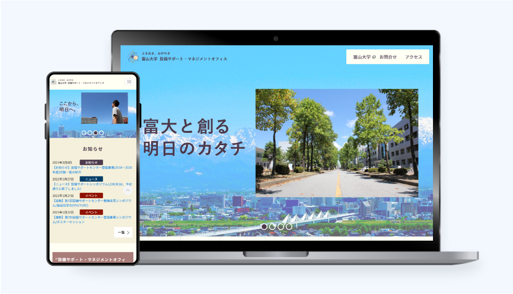 富山大学内の大型機器の一元管理、また、近隣大学、企業との連携により地域産業の活性化を目指す富山大学設備サポート・マネジメントオフィス様のWebサイトを制作いたしました。