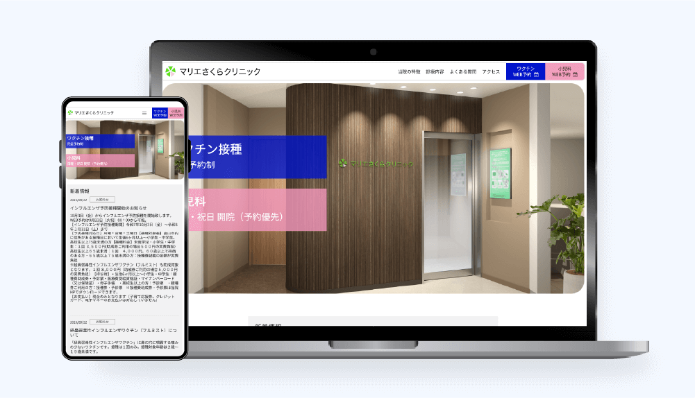 感染対策をしっかりと行っているこのクリニックの特徴と、完全予約により忙しい方々を待たせることなく予防接種ができるスピード感を表現するため、質実でシンプルなデザインにしています。
