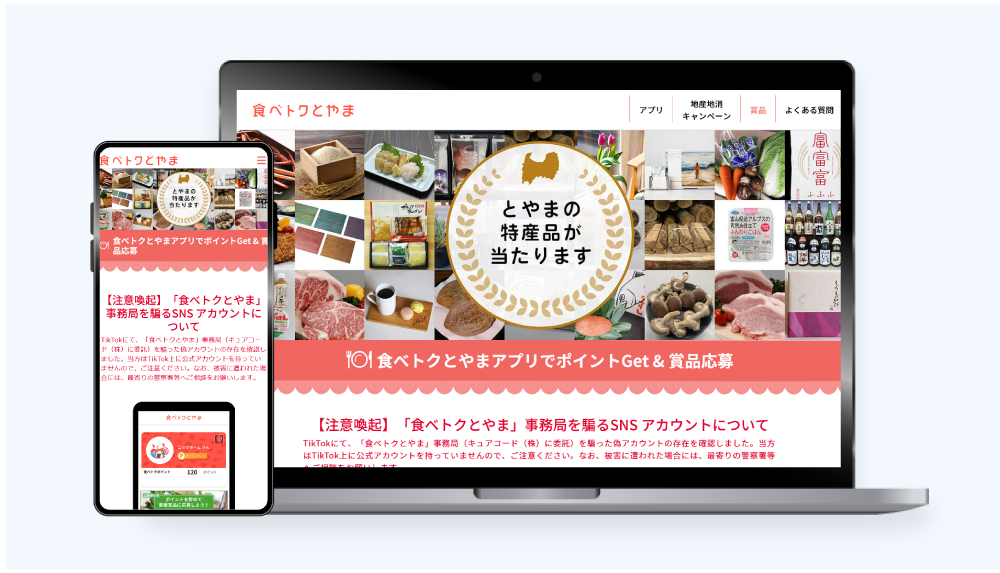 富山県内の地産地消を推進する「富山県産品購入ポイント制度」を便利に利用できるスマートフォンアプリ「食べトクとやま」の紹介ページを制作いたしました。