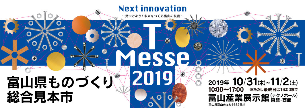 2019年10月31日(木)~11月2日(土)の三日間に富山産業展示館(テクノホール)で開催される「T-Messe2019 富山県ものづくり総合見本市」に富山県中小企業団体中央会様のブースの一部として弊社も出展いたします!